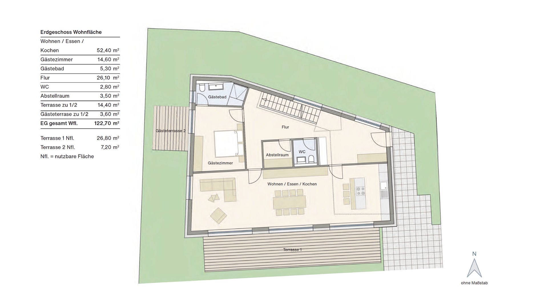 Attraktiver, kubistischer Entwurf einer außergewöhnlichen Immobilie. Durch die optimale Anpassung an das trapezförmige Grundstück ergibt sich eine Grundrisszuschnitt, den man nicht alle Tage wiederfindet. Im Erdgeschoss befindet sich ein großzügiger, langgestreckter, sonnendurchfluteter Raum mit Küche, Ess- und Wohnzimmer als moderne, offene Lösung und großer Gartenterrasse, die über großflächige Glastüren erreichhbar ist. Der Gästebereich verfügt über ein eigenes Bad und eine separate Gartenterrasse. Ein großes Schlafzimmer, zwei Kinderzimmer und ein tolles Familienbad befinden sich im Obergeschß, das von einer teilweise begrünten Dachterrasse umschlossen wird. In der Teilunterkellerung befindet sich der Technikraum.